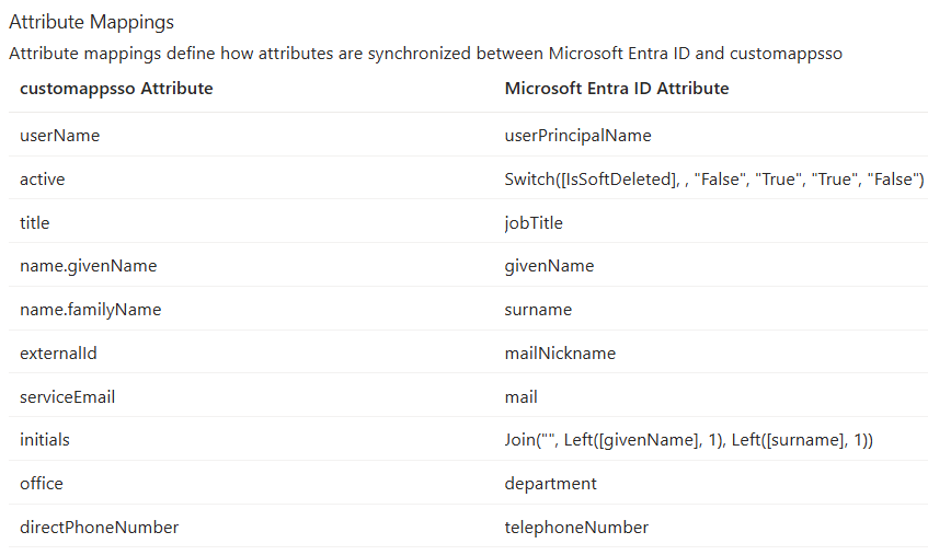 Example mapping - please note that Entra attributes may differ based on your tenant setup in Entra.