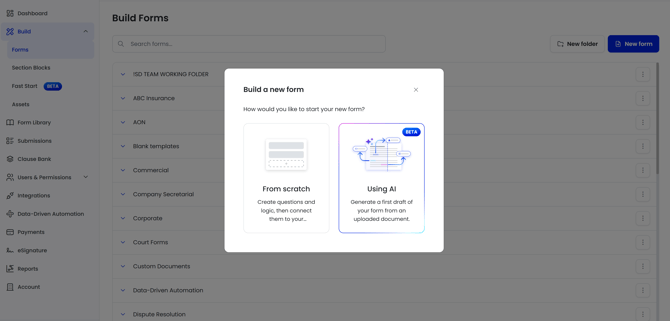 - A new modal will appear to ask whether to build a new from From scratch or Using AI. Select Using AI.