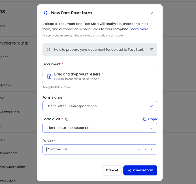Fast Start analyses the document, breaks it into logical sections, builds the form with appropriate field name and field types, and links the template automatically. It even maps merge fields and placeholders to Smarter Drafter Field IDs.