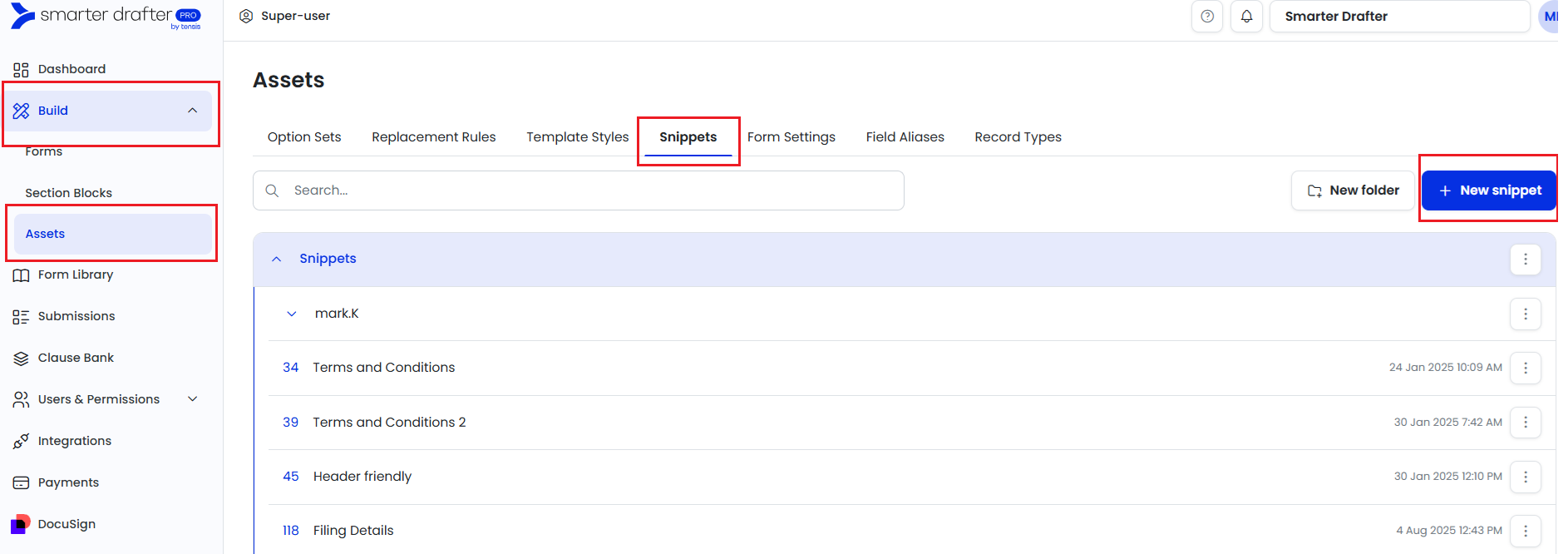 Static snippets are reusable blocks of text that can be inserted into templates. They’re perfect for standard clauses or paragraphs that don’t need to change based on the form submission. Once created, they can be added to any Word template using the Word Add-In.